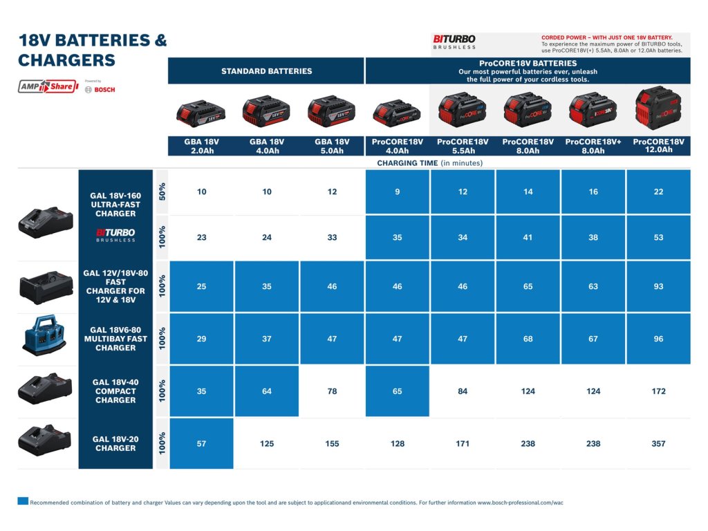 12V a 18V rychlonabíječka. Jednoduchá a praktická: jedna nabíječka pro všechny vaše 12V a 18V akumulátory Bosch Professional. Rychlé nabíjení proudem 8 A, které plně nabije akumulátor 18V 5,5Ah za 46 minut a akumulátor 12V 4,0Ah za 37 minut. Zkracuje prostoje díky inteligentnímu systému Active Air Cooling 3.0, který chladí akumulátor před, během a po nabíjení. Praktická a kompaktní díky řešení typu bay-in-bay.
