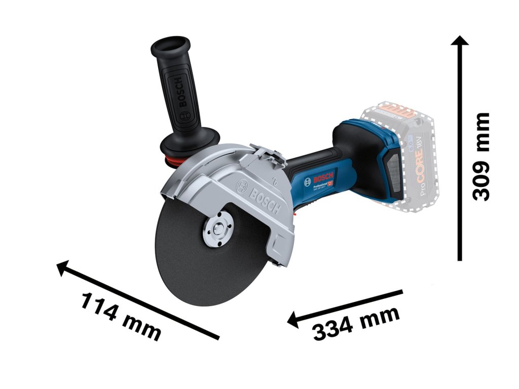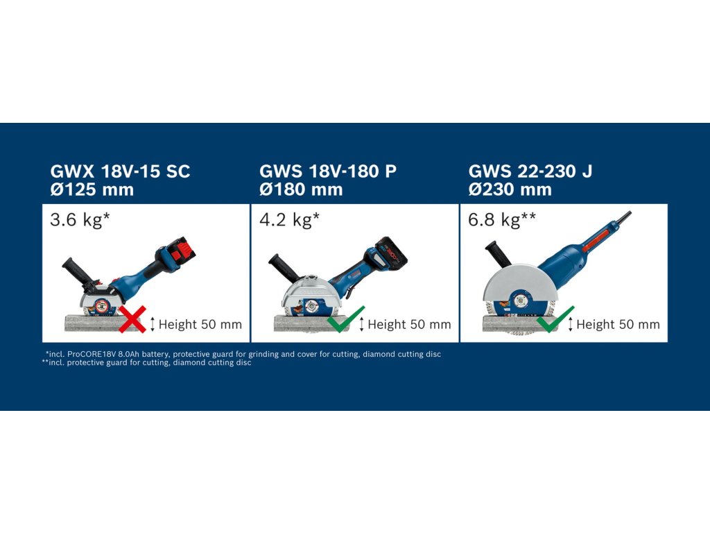 Díky 180 mm kotouči a malé převodové hlavě dosahuje GWS 18V-180 P stejné hloubky řezání jako 230 mm velká úhlová bruska, ale s hmotností nižší o 35 procent. Technologie BITURBO Brushless jí dodává dostatek síly na rychlé řezání různých materiálů. Jednou z hlavních předností úhlové brusky je vysoká úroveň ochrany uživatele. Spínač PROtection po uvolnění okamžitě vypne nářadí, funkce KickBack Control předchází nečekanému zpětnému rázu a Intelligent Brake System zase výrazně zkracuje dobu brzdění. GWS 18V-180 P Professional řeže všechny druhy kovů, beton, cihly a dlaždice. Úhlová bruska je kompatibilní se všemi 18V akumulátory a nabíječkami Bosch Professional (profesionální 18V systém) a se všemi akumulátory a nabíječkami AMPShare Alliance; pro maximální výkonnost použijte ProCORE18V ≥ 5,5 Ah. Kompatibilní také s AMPShare, aliancí akumulátorů více značek.