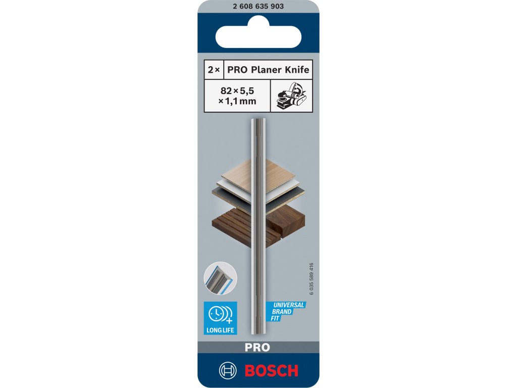 Náhradní hoblovací nože Bosch - jednostranné. Sada 2 kusů z rychlořezné oceli (HSS). Navrženo pro hoblování dřeva - Efektivní hoblování dřeva.