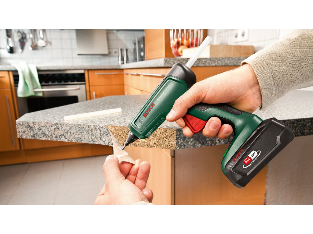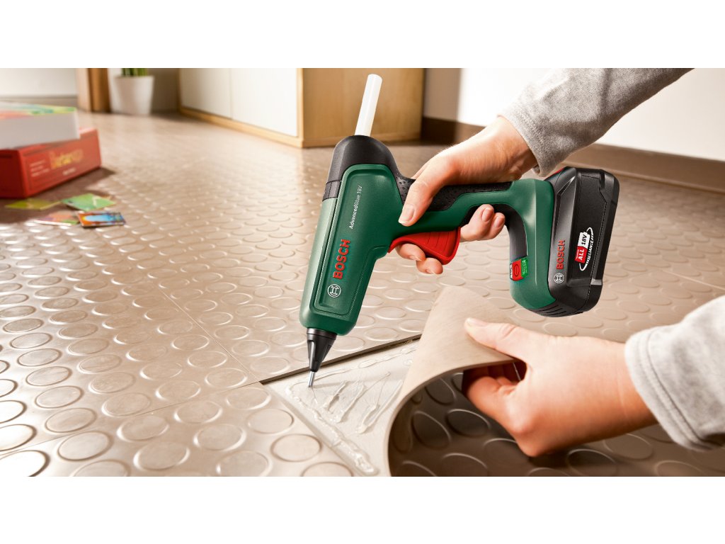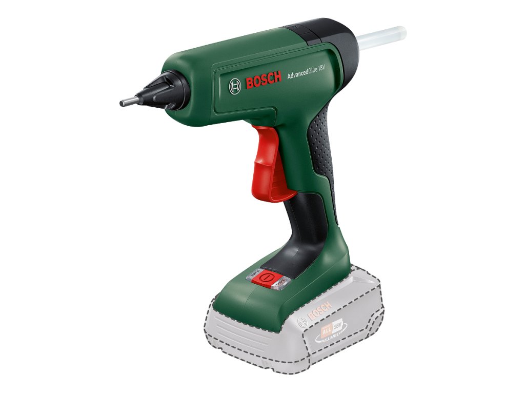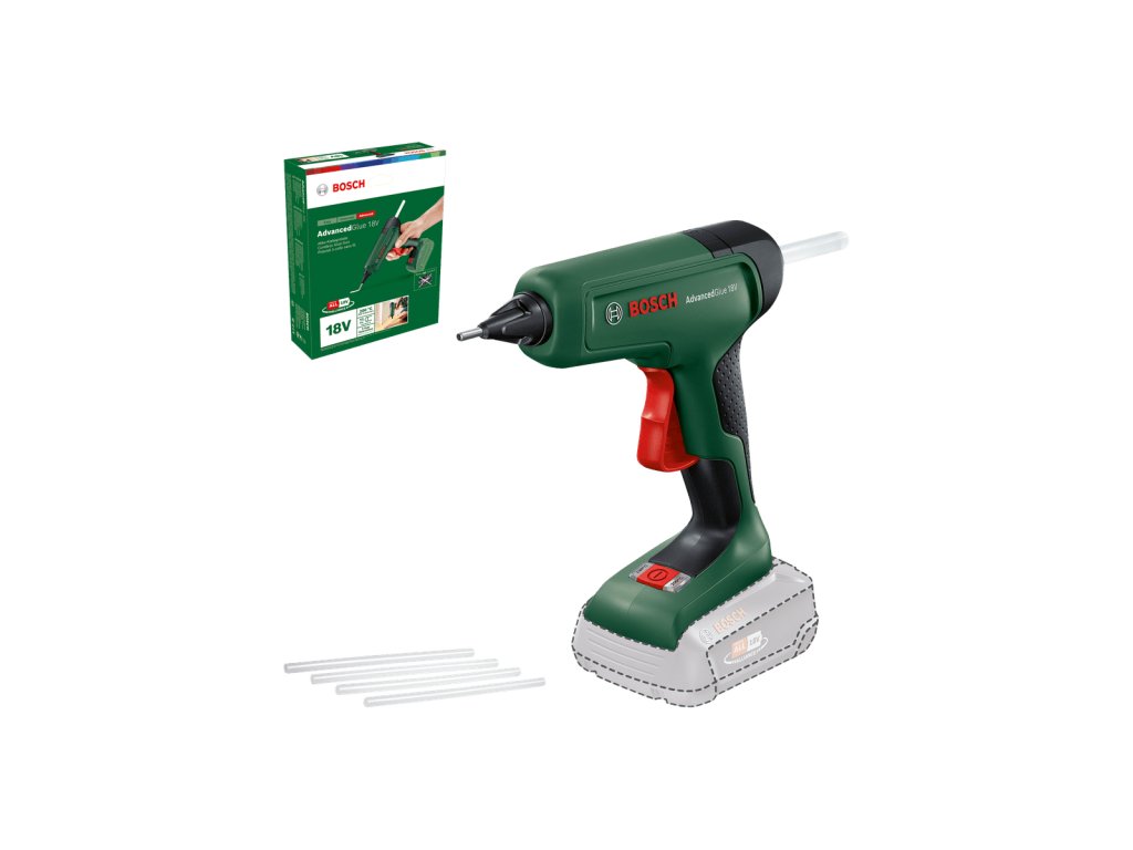 AdvancedGlue 18V je výkonná akumulátorová horkovzdušná pistole, která se svou účinností vyrovná síťovému nářadí a je kompatibilní s akumulátorovým systémem Bosch 18V. Pistole se zahřeje a je připravena k použití za pouhých 90 sekund. Poskytuje optimální lepení pro dokonalé spojení i dostatečně dlouhou dobu na případné opravy díky tepelné technologii Bosch pro konstantní vysokou teplotu. Režim duální teploty nabízí 200 °C pro maximální adhezi při kutilství či opravách a 130 °C ideálních na práci na projektech citlivých na teplo. Toto chytré nářadí rovněž šetří energii tím, že se v případě nečinnosti vypne.