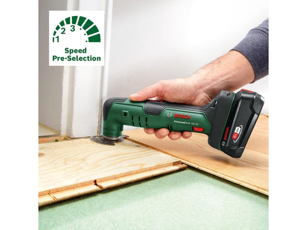 Lehké a uživatelsky přívětivé nářadí UniversalMulti 18V-32 je výkonné univerzální nářadí na řadu kutilských projektů. Je kompatibilní se širokou škálou příslušenství Starlock, takže jej lze použít na řezání kovů, odstraňování malty, řezání dveřních rámů a mnoho dalšího. Pro rychlou a snadnou výměnu příslušenství drží MagnetHold příslušenství pevně na místě, když je zasunutý upevňovací šroub. Součástí dodávky je klíč na vnitřní šestihrany na montáž příslušenství. Toto kompaktní univerzální nářadí se vyznačuje elektronickou předvolbou otáček, která zajišťuje správné nastavení rychlosti pro danou práci a materiál. Součástí balení je nastavitelný hloubkový doraz. Ten usnadňuje přesné opakované nebo dlouhé řezy stejné hloubky při použití segmentového kotouče. Nářadí je efektivní, ergonomické a zajišťuje vysoký výkon. Lze přidat volitelnou rukojeť. Zabudovaná technologie Bosch Syneon poskytuje optimální výkonnost a maximální dobu chodu. Toto nářadí patří do systému 18V POWER FOR ALL. Jeden akumulátor lze používat s veškerým nářadím 18V POWER FOR ALL.